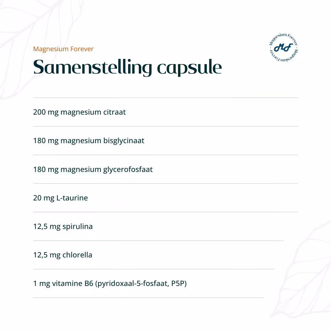 Magnesium Complex van Magnesium-Forever is een zorgvuldig samengestelde formule die drie goed opneembare vormen van magnesium combineert: magnesiumbisglycinaat, magnesiumcitraat en magnesiumglycerofosfaat. Deze combinatie is bewust gekozen vanwege de hoge biologische beschikbaarheid, zodat het lichaam het magnesium efficiënt kan opnemen en optimaal kan benutten.