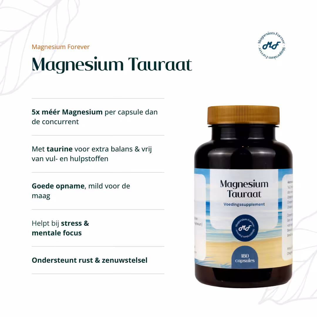 Magnesium Tauraat van Magnesium-Forever is een zorgvuldig samengestelde formule waarin magnesium is gebonden aan het aminozuur taurine. Deze combinatie staat bekend om de goede opneembaarheid en is bijzonder geschikt voor dagelijks gebruik, vooral wanneer je lichaam wat extra ondersteuning kan gebruiken om in balans te blijven.
