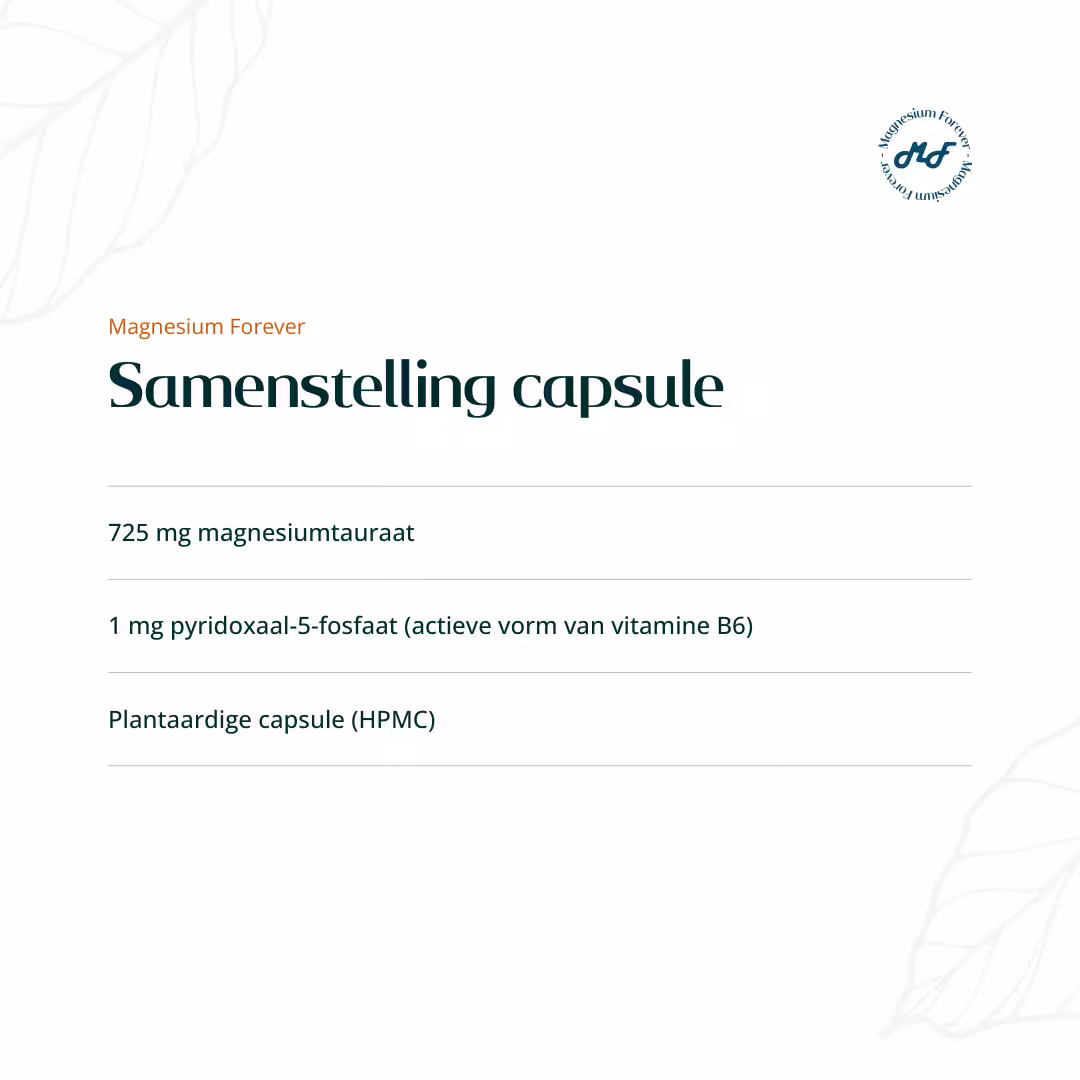 Magnesium Tauraat is ontwikkeld als een zuivere, doordachte aanvulling op de dagelijkse voeding. Vrij van onnodige vulstoffen en kunstmatige toevoegingen, zoals je van Magnesium-Forever mag verwachten. Een hoogwaardige formule voor wie kiest voor ondersteuning van spieren, zenuwstelsel en algehele balans.