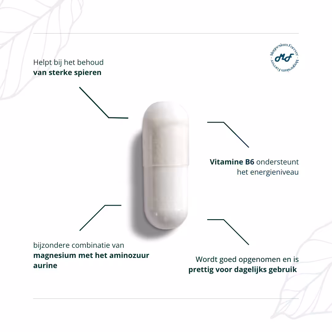 Magnesium is een essentieel mineraal dat bijdraagt aan een normale spierfunctie en een goed functionerend zenuwstelsel. Alle spieren in het lichaam – van grote spiergroepen tot de voortdurend actieve hartspier – zijn afhankelijk van een goede magnesiumbalans. Daarnaast helpt magnesium vermoeidheid en moeheid te verminderen en ondersteunt het de normale energiestofwisseling. Een stabiel magnesiumgehalte draagt bij aan een gevoel van rust en lichamelijke balans.